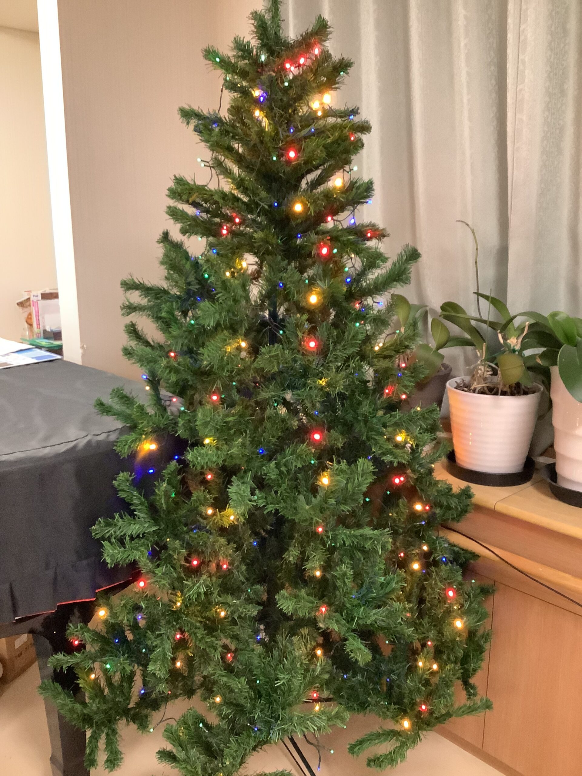 フロア(大広間)に大きなクリスマスツリーが飾られた。樹高2メートルを超すほどのモミの木に七色の沢山の豆電球がキラキラと点滅している。それをみて「ああ師走(十二月)になったのだなー」と思う。