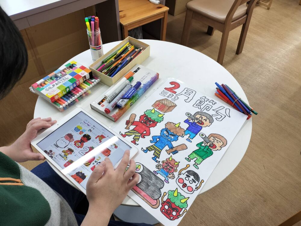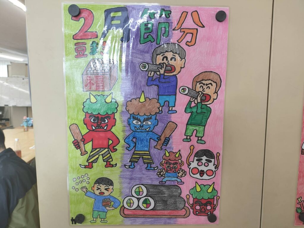 就労なでしこ 季節のポスター製作 2026.01.28 2026年が始まって1か月が経とうとしていますね。 日も長くなってきて、季節も冬から春に向かっているように感じます。 就労なでしこでは、月ごとに利用者さんがポスターを描いており、 季節を感じる素晴らしい作品ができあがっています。 2月は節分ですね、豆や鬼たちがたくさん描かれています。 「きれいにできた~!」と完成した作品を見せてくれました! 次回以降の作品もお楽しみに♪ 022-385-7223 担当:橋場(はしば) 仙台市若林区大和町4丁目13-27(工房なでしこ1階) 就労継続支援事業所なでしこのページ 就労継続支援事業所なでしこのブログ Twitter Instagram Post Share Hatena Pocket RSS 就労なでしこコメント: 0 楽しみながら続ける、なでしこの商品づくり